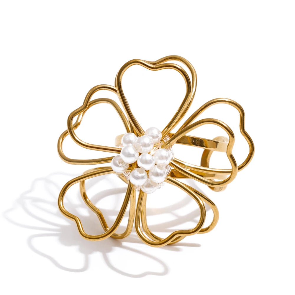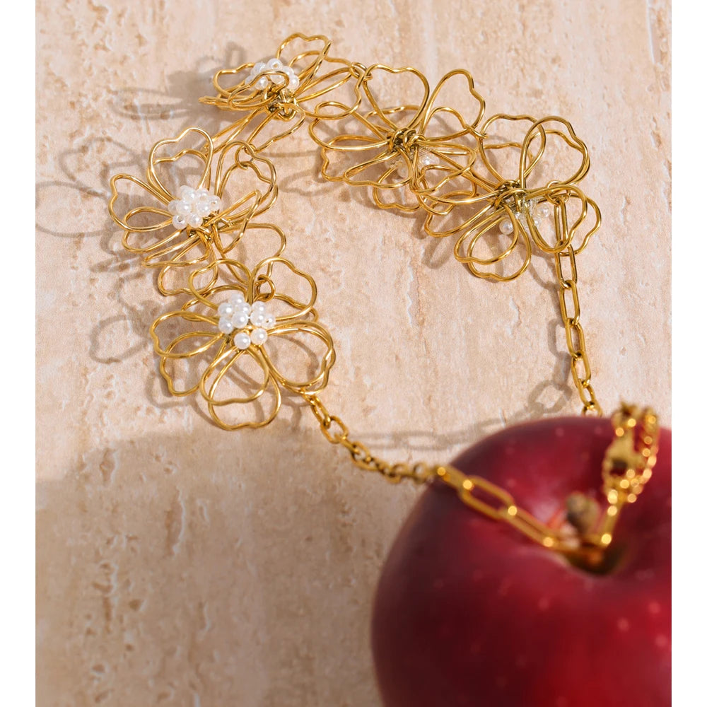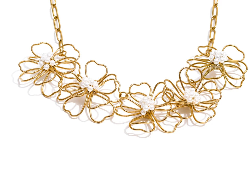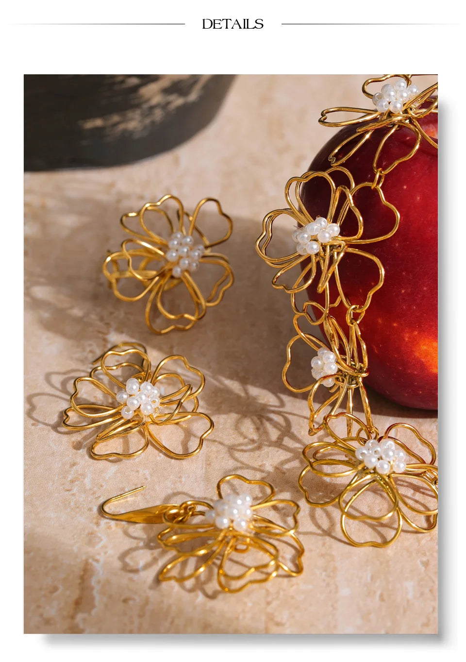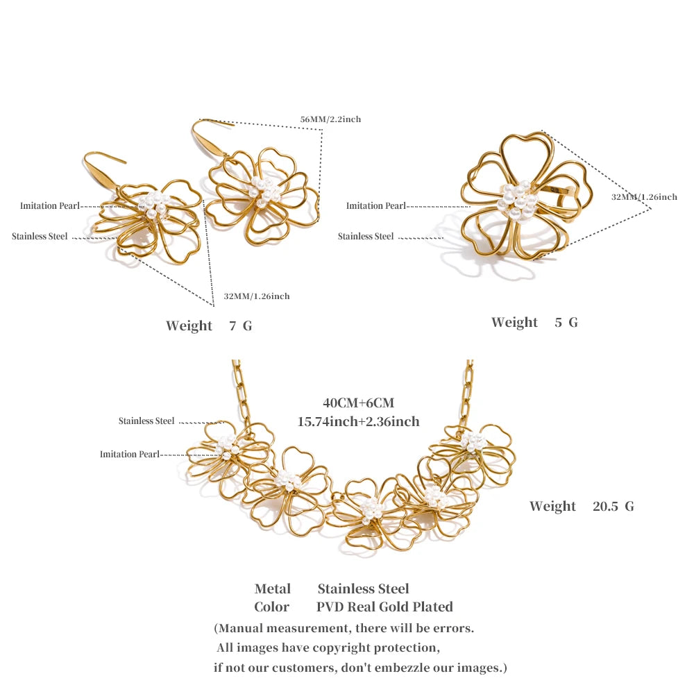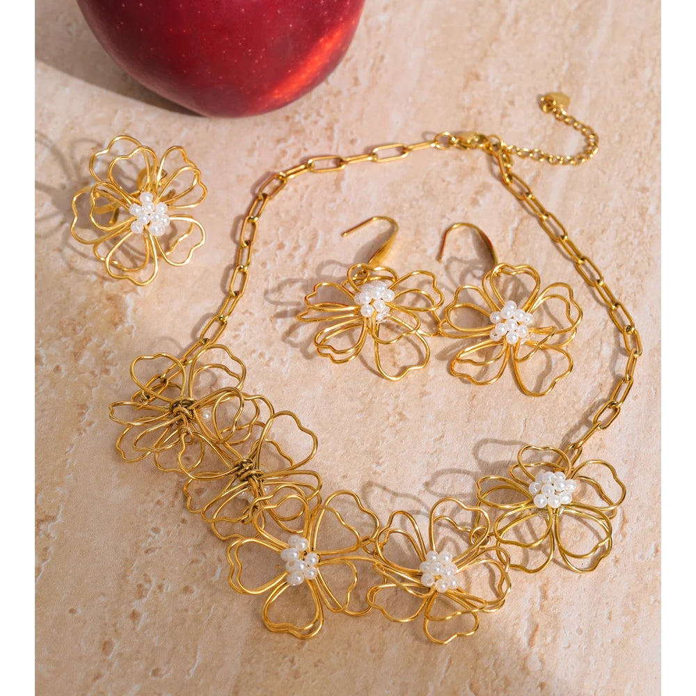 A trendy and beautiful, 4 piece set, comprising of a necklace, a pair of earrings and a ring, all set in a lovely flower design and cohesive through out all items. It is in gold, wonderful, light-weight and set to last a long time. Can withstand sweat, ocean water and harsh conditions. Keep away from soap.
