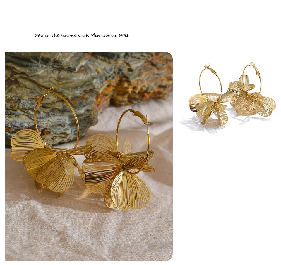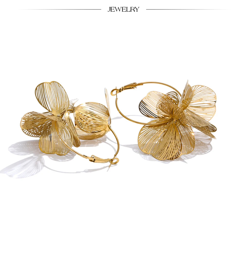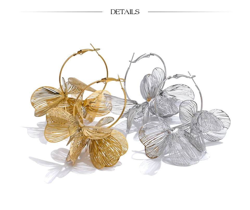 Stylish, out of norms and trends. This geometric statement piece, looks like wide flowers butt rest inside a circular hoop. Net like, film like, lightweight, airy and stylish. Beauty and wonder in timeless pieces.