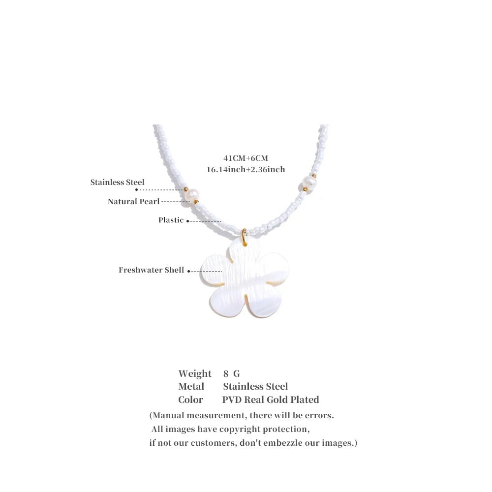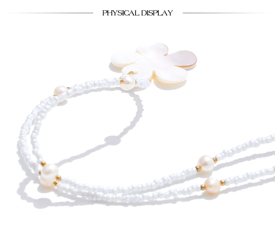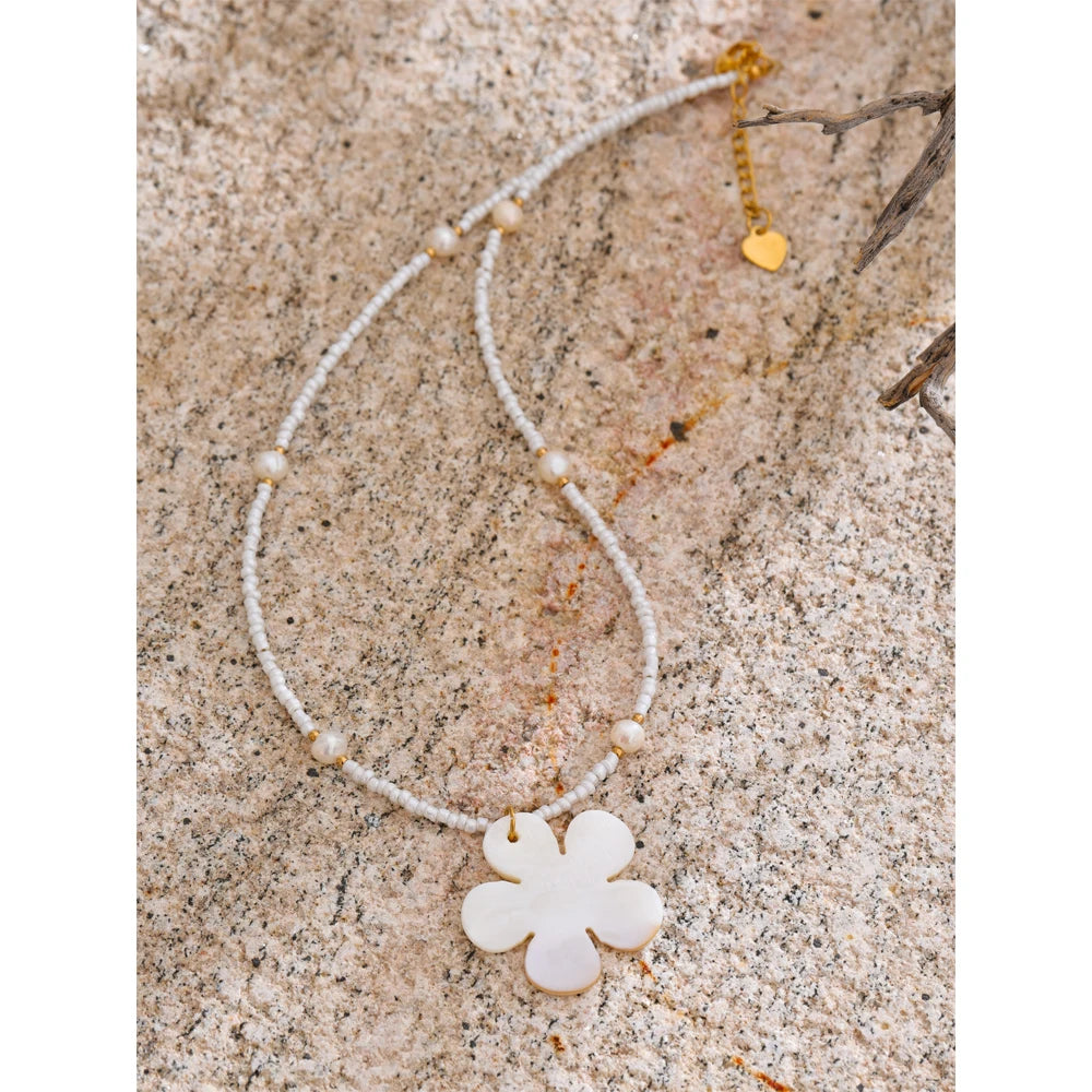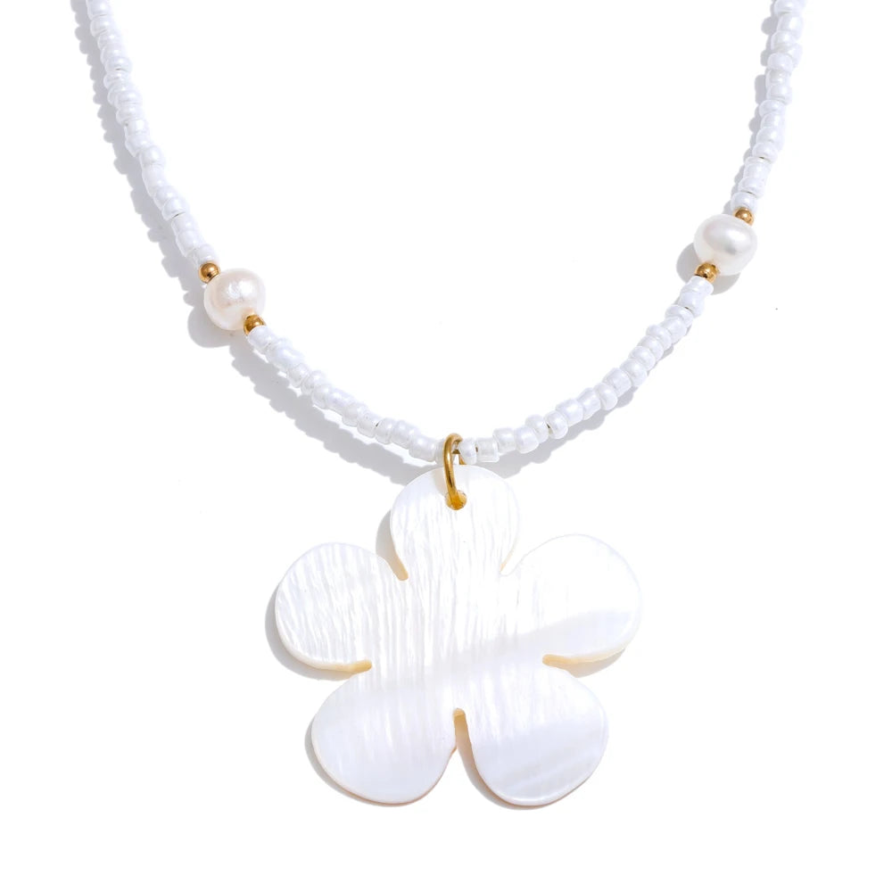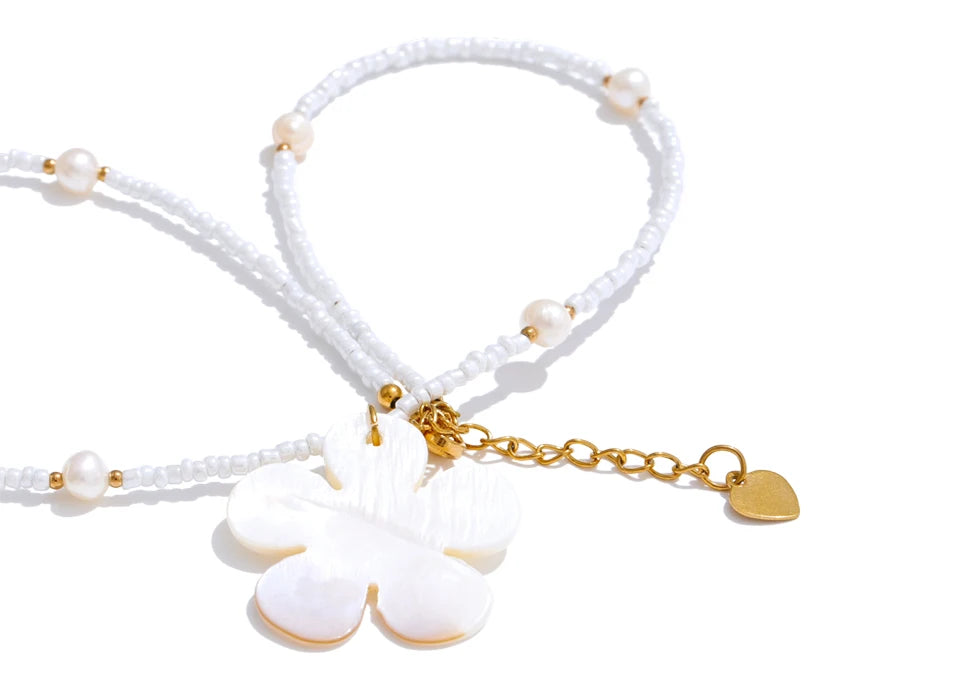 Summer vibes, summer times - awaken with this one of a kind Freshwater flower shell accompanied by steel gold chains, pearls set strategically and plastic teeth white beads. It is beautiful, light, fitted with any summer outfit, it is authentic and a masterpiece in it's league. Awaken the heart of summer knowing it is waterproof as well as sweatproof.