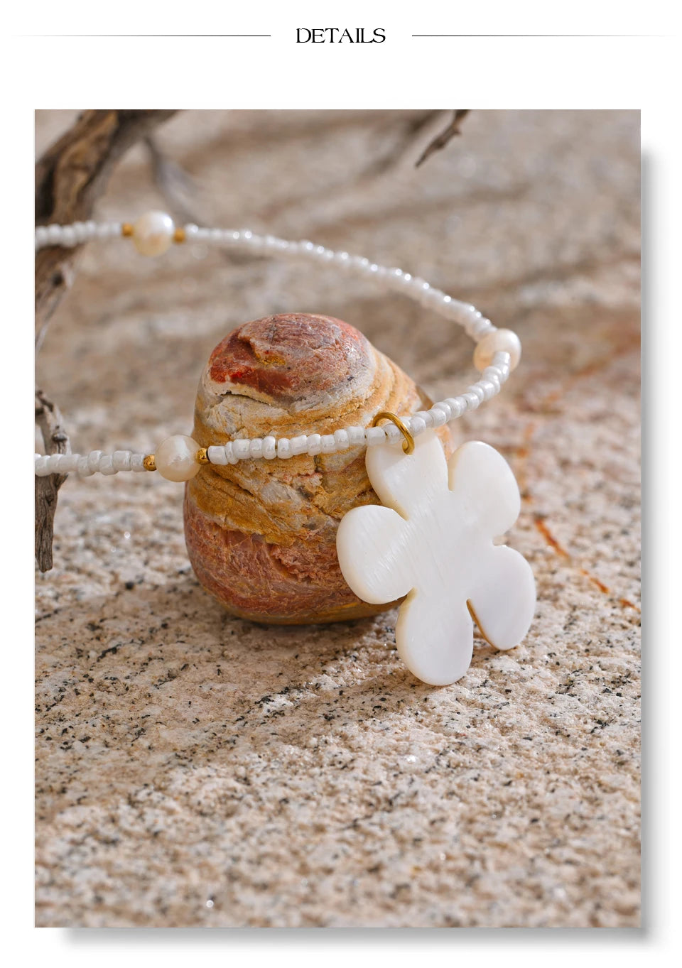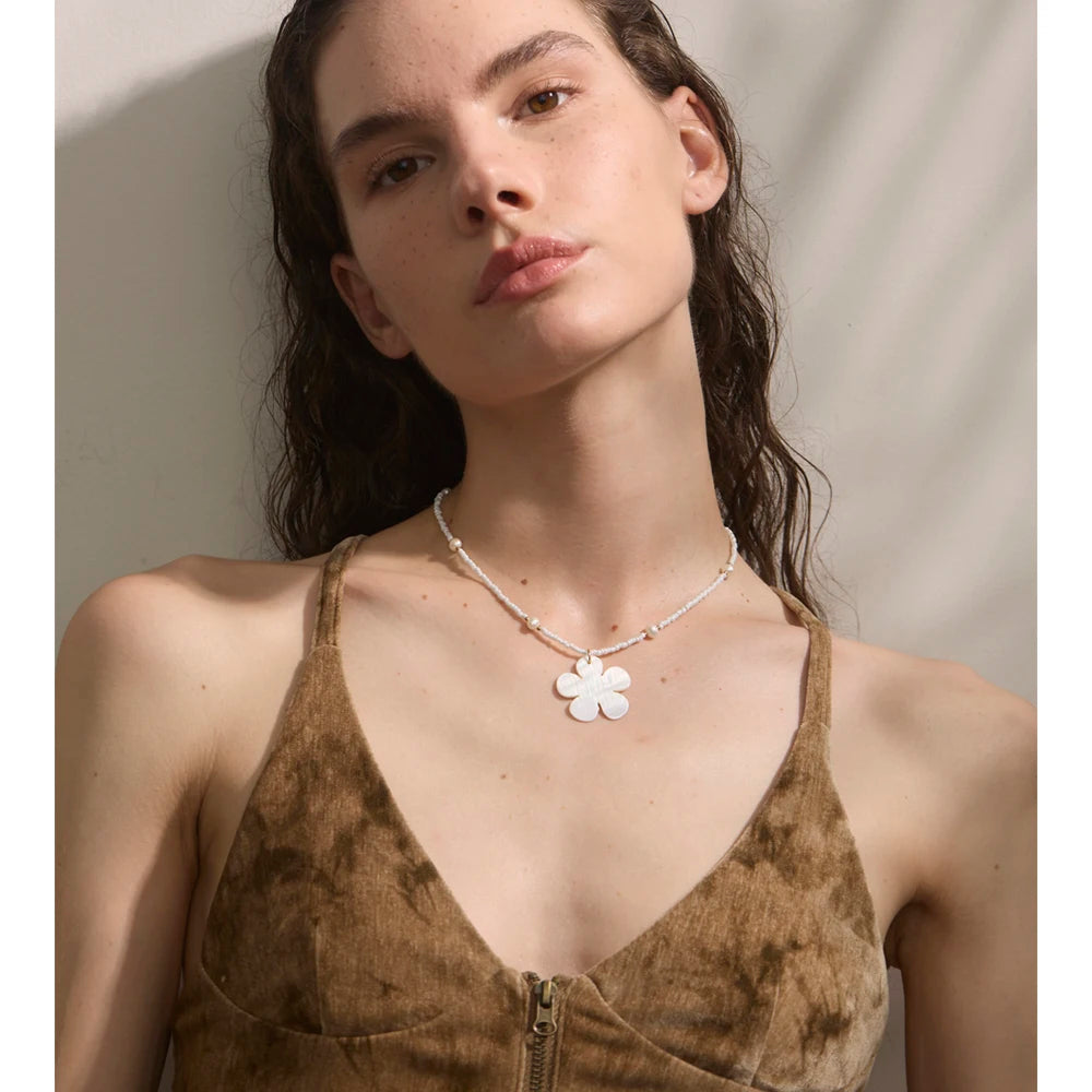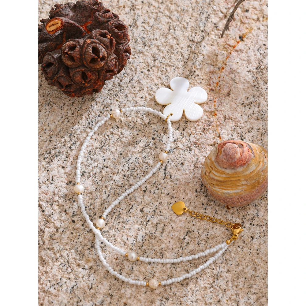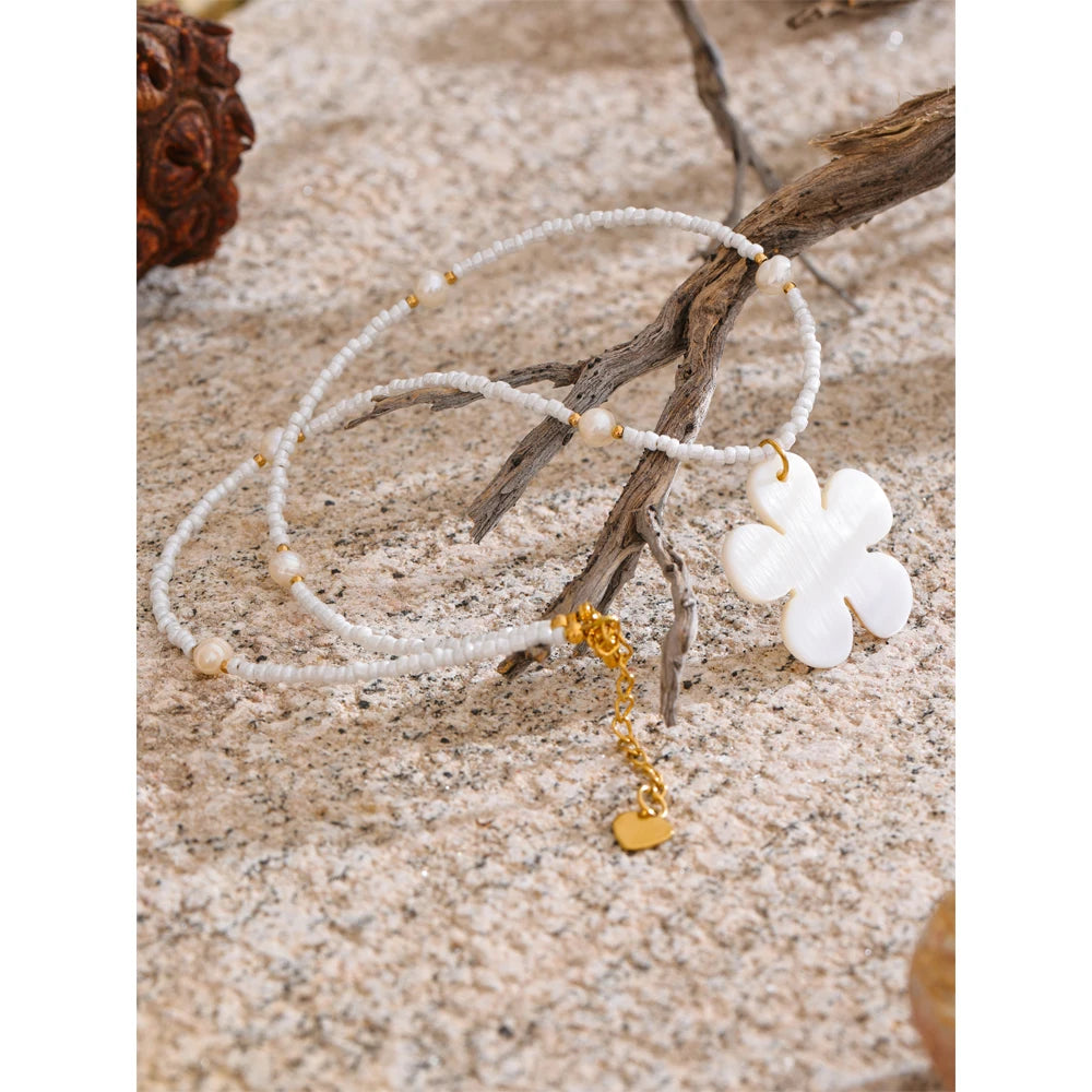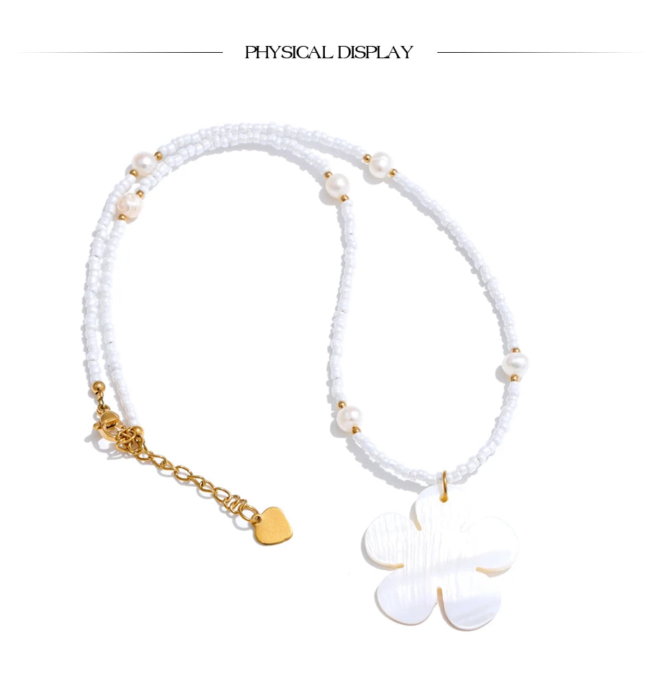 Summer vibes, summer times - awaken with this one of a kind Freshwater flower shell accompanied by steel gold chains, pearls set strategically and plastic teeth white beads. It is beautiful, light, fitted with any summer outfit, it is authentic and a masterpiece in it's league. Awaken the heart of summer knowing it is waterproof as well as sweatproof.