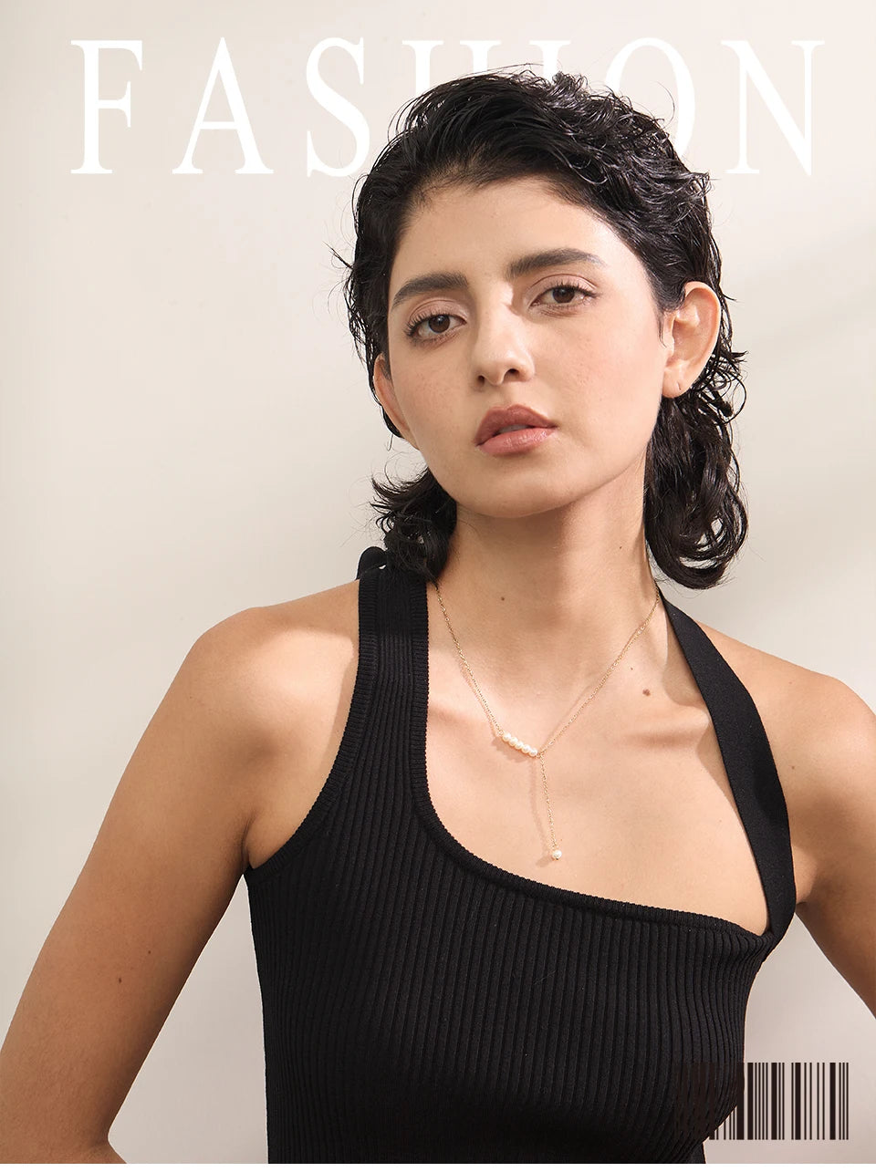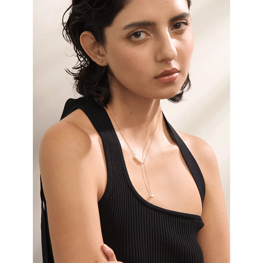A beautiful pearl necklace with a pearl chain and adjustable length. Just pull the pearl pendant and turn it into a choker, or one of added length. Agrees with the sun, suitable for the ocean and made to last. Stainless gold and platinum steel, allergy-free, no cadmium/lead.